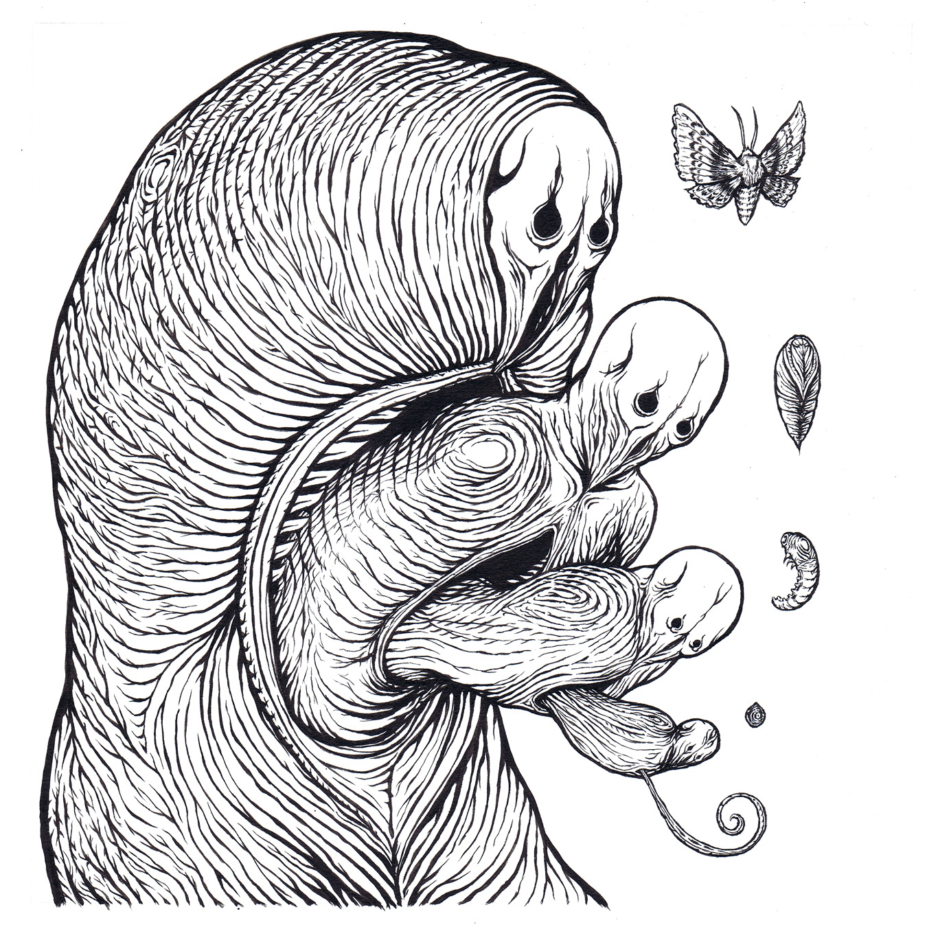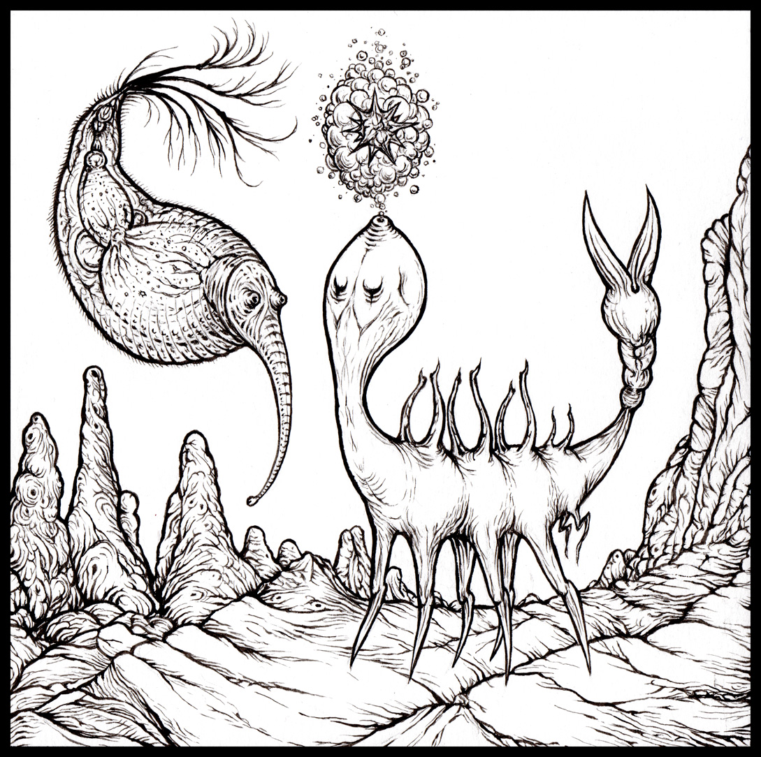 All three original ink drawings for the irr. app. (ext.) + At Jennie Richie ‘Night Wearing Feathers’ LP package (‘Night Wearing Feathers’, ‘Sunshine Bus Rider’ and ‘Intermediaries’), plus a signed copy of the LP [edition of 234] and a signed copy of the ‘Unknown Invertebrate Drama’ collaborative C33 [edition of 66]