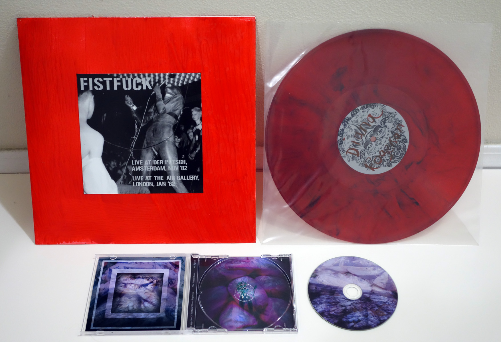I’ve uncovered an extra copy of the rare Fistfuck LP ‘Live At Der Putsch, Amsterdam, Nov ’82 / Live At The Air Gallery, London, Jan ’82’. Fistfuck was one of Diana Rogerson’s pre-NWW projects; more information about this can easily be found online. The LP was limited to 150 numbered copies (this is #50) and is pressed on marbled red vinyl. [note: the cover is heavy paper coated on the outside with red latex; the latex aggressively sticks to any protective plastic sleeve, so to make things easier I’ve slit a plastic sleeve down the side so the LP can be removed without having to slide the cover out, and added another sleeve around that sleeve to keep everything safely contained.]