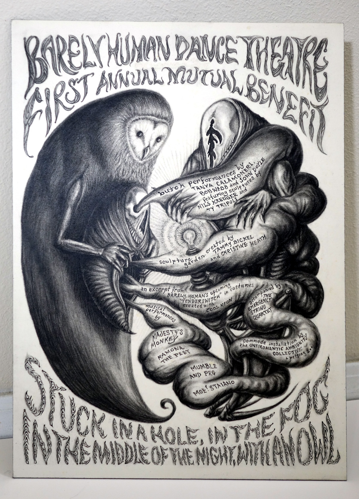 note: This was a poster created for a benefit event for the Barely Human Dance Theatre in 2002. There is some slight wear & minor discolouration on the board in a few areas, but overall it looks as represented in the photo.