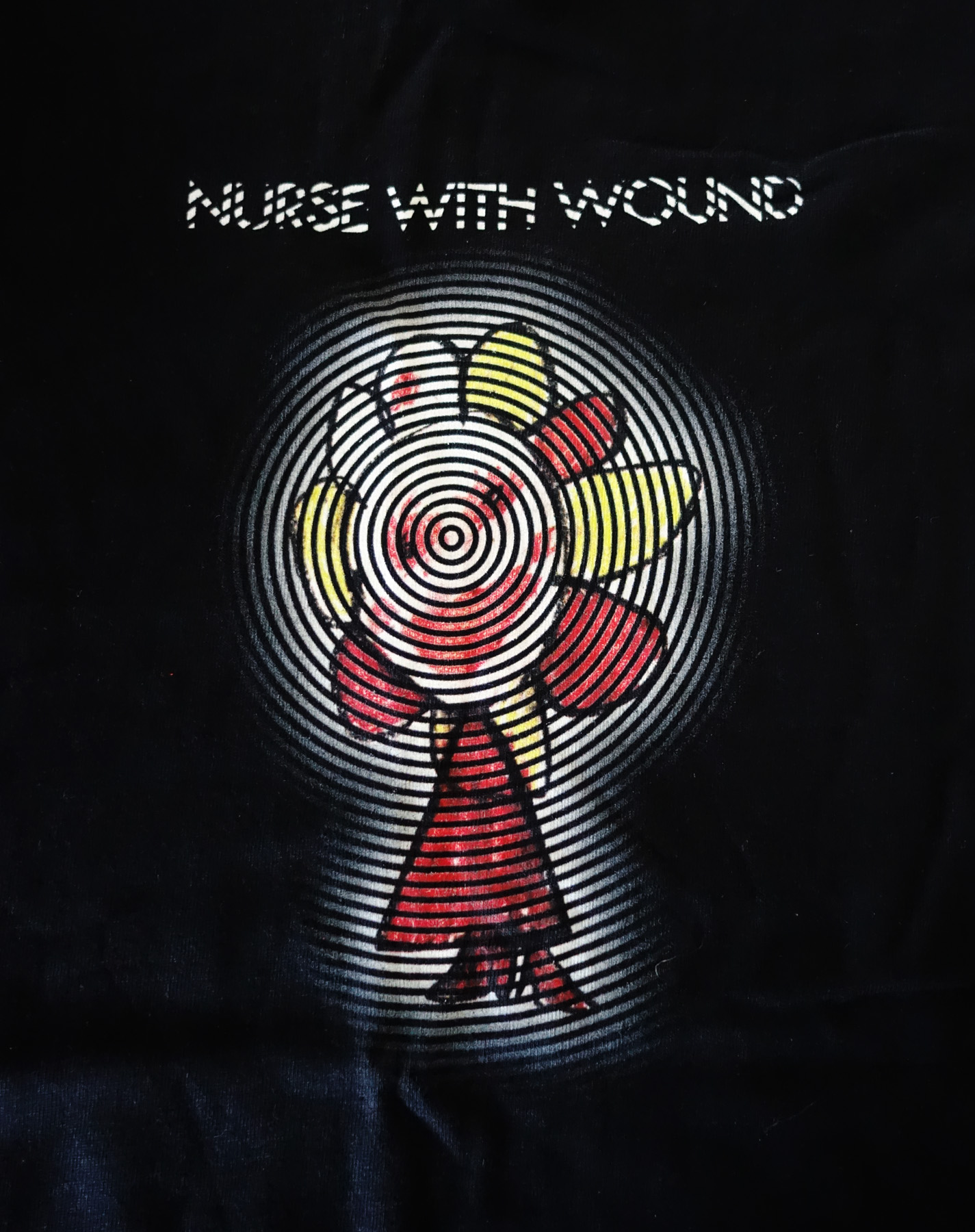 While preparing for the tragic necessity of having to move later in the year, I came across a small stash of Nurse With Wound shirts: a handful of the shirts made for the Queen Elizabeth Hall show way back in 2007 (featuring the ‘Shipwreck Radio Final Broadcast’ image) and two of the ‘flower girl’ shirts (using the ‘Rock ‘N’ Roll Station’ cover image, drawn by a young Lily Stapleton). I’m offering them for sale at $15 + postage each. These are black, standard, short-sleeve shirts, and are all new, never-been-worn items. The images above are actual photographs of the actual shirt designs, photographed by an actual photographer who was eating pho while wearing a toga made out of graph paper. They are available in the following sizes and quantites: